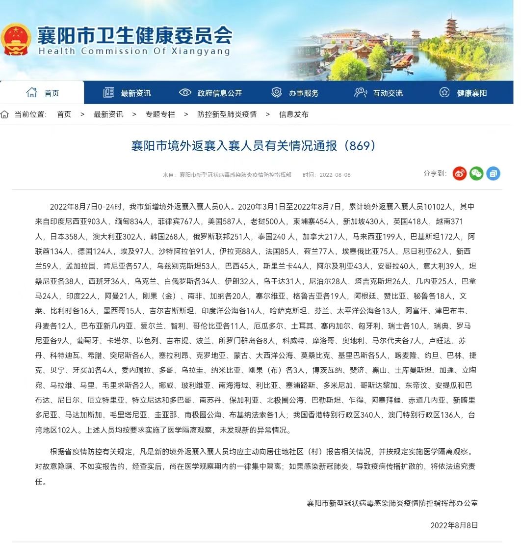 2022年8月7日0-24时,我市新增境外返襄入襄人员0人。2020年3月1日至2022年8月7日,累计境外返襄入襄人员10102人,其中来自印度尼西亚903人,缅甸834人,菲律宾767人,美国587人,老挝500人,柬埔寨454人,新加坡430人,英国418人,越南371人,日本358人,澳大利亚302人,韩国268人,俄罗斯联邦251人,泰国240 人,加拿大217人,马来西亚199人,巴基斯坦172人,阿联酋134人,德国124人,埃及97人,沙特阿拉伯91人,伊拉克88人,法国85人,荷兰77人,埃塞俄比亚75人,尼日利亚62人,新西兰59人,孟加拉国、肯尼亚各57人,乌兹别克斯坦53人,巴西45人,斯里兰卡44人,阿尔及利亚43人,安哥拉40人,意大利39人,坦桑尼亚各38人,西班牙36人,乌克兰、白俄罗斯各34人,伊朗32人,乌干达31人,尼泊尔28人,塔吉克斯坦26人,几内亚25人,巴拿马24人,印度22人,阿曼21人,刚果(金)、南非、加纳各20人,塞尔维亚、格鲁吉亚各19人,阿根廷、赞比亚、秘鲁各18人,文莱、比利时各16人,墨西哥15人,吉尔吉斯斯坦、印度洋公海各14人,哈萨克斯坦、芬兰、太平洋公海各13人,阿富汗、津巴布韦、丹麦各12人,巴布亚新几内亚、爱尔兰、智利、哥伦比亚各11人,厄瓜多尔、土耳其、塞内加尔、匈牙利、瑞士各10人,瑞典、罗马尼亚各9人,葡萄牙、卡塔尔、以色列、吉布提、波兰、所罗门群岛各8人,科威特、摩洛哥、奥地利、马尔代夫各7人,卢旺达、苏丹、科特迪瓦、希腊、突尼斯各6人,塞拉利昂、克罗地亚、蒙古、大西洋公海、莫桑比克、基里巴斯各5人,喀麦隆、约旦、巴林、捷克、贝宁、牙买加各4人,委内瑞拉、多哥、乌拉圭、纳米比亚、刚果(布)各3人,博茨瓦纳、斐济、黑山、土库曼斯坦、加蓬、立陶宛、马拉维、马里、毛里求斯各2人,挪威、玻利维亚、南海海域、利比亚、塞浦路斯、多米尼加、哥斯达黎加、东帝汶、安提瓜和巴布达、尼日尔、厄立特里亚、特立尼达和多巴哥、南苏丹、保加利亚、北极圈公海、巴勒斯坦、乍得、阿塞拜疆、赤道几内亚、新喀里多尼亚、马达加斯加、毛里塔尼亚、圭亚那、南极圈公海、布基纳法索各1人;我国香港特别行政区340人,澳门特别行政区136人,台湾地区102人。上述人员均按要求实施了医学隔离观察,未发现新的异常情况。
