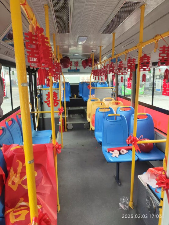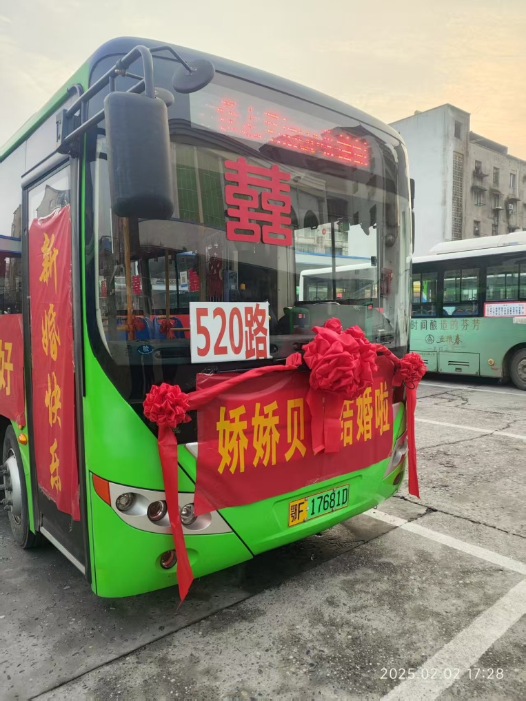 车头飘扬着鲜艳的红绸,车窗上贴满了寓意吉祥的双喜字,车内则挂满了温馨的红色装饰,车身更是精心印制着新人的甜蜜合影和深情告白。这辆满载着爱与祝福的公交车,仿佛化身为一座移动的幸福殿堂,穿梭在街头巷尾,吸引着无数行人的目光与祝福。