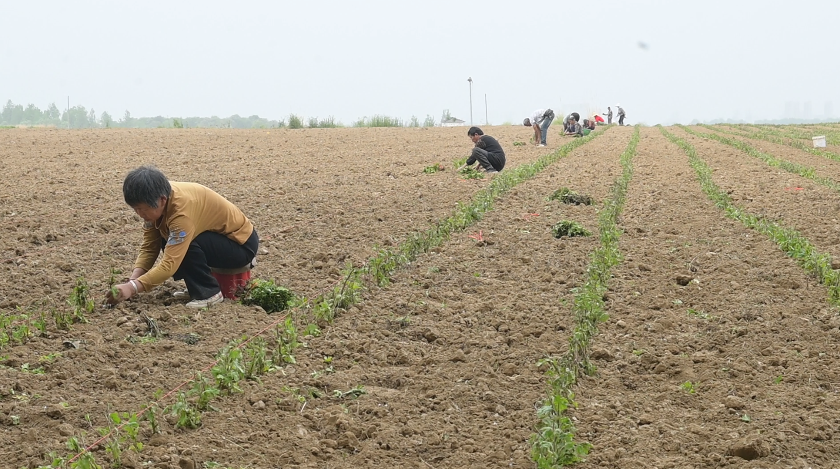 近日,走进仙人渡镇湖北闽光农业科技有限公司杭白菊种植基地,30多位村民正在挖窝、送苗、浇水,栽种杭白菊幼苗,田野里一片绿意。