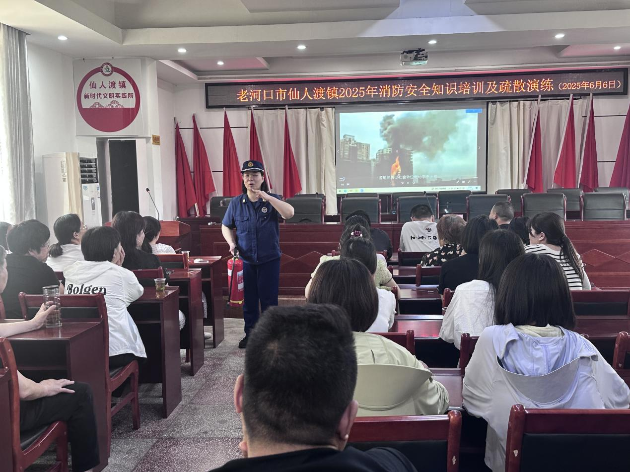 6月6日,仙人渡镇联合市消防救援大队开展消防安全培训及实战演练活动。镇机关干部、“九小场所”经营户及企业负责人等参加活动。