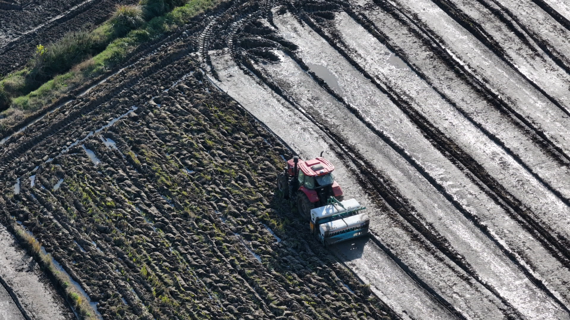 眼下正是小麦播种的关键期,今年持续降雨让必位岗村的农田土壤相对含水量接近80%,传统播种机容易出现壅堵、播种深浅不一等问题。为破解这一难题,当地引进新型一体化播种机,集旋耕、施肥、播种、镇压四道工序于一体,不仅避免机械反复下地破坏土壤结构,还能通过精准调控播种深度至2-3厘米,完美适配当前湿墒条件。大型播种机在田间匀速穿梭,旋耕刀破土碎土、施肥管精准送肥、播种器匀播麦种、镇压轮压实土壤,一套流程一气呵成,湿润的田地上很快留下整齐的播种痕迹,机器过后土壤平整无明显碾压痕迹。