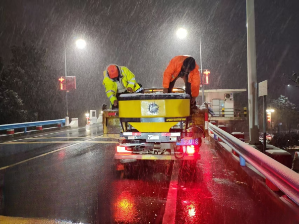 降雪开始后,该中心组织除雪保畅应急人员加大对重点路段和桥梁的巡查频次,采用“定点监测+动态巡逻”相结合的方式,实时掌握雪情路况。夜幕降临后,气温持续走低,除雪保畅进入关键阶段。大家放弃跨年休息,顶风冒雪奔赴一线,采取“人工+机械”相结合的方式,对316国道马冲水库溢洪道中桥,316省道蛮子湾坡、光化汉江大桥等重点路段与桥梁连夜开展融雪除冰作业,预防路面和桥梁结冰。