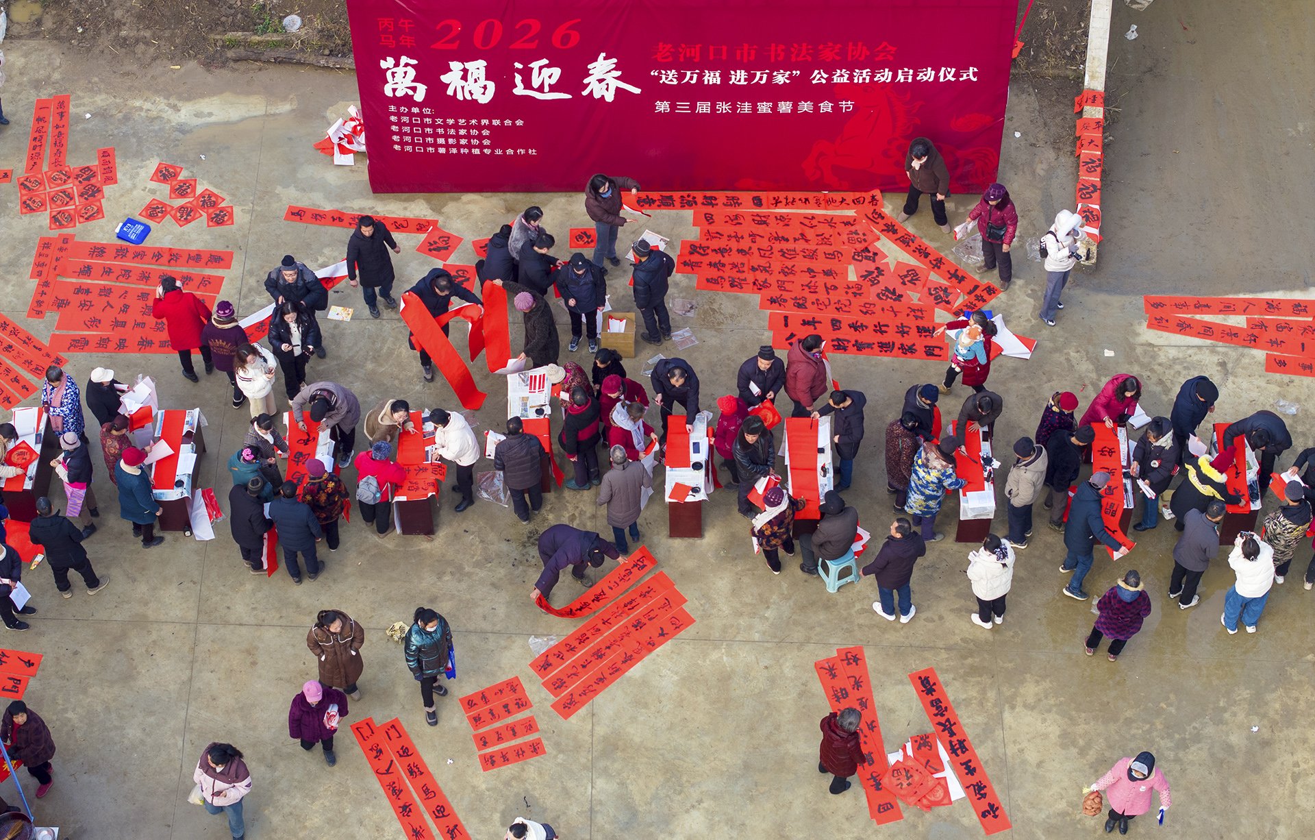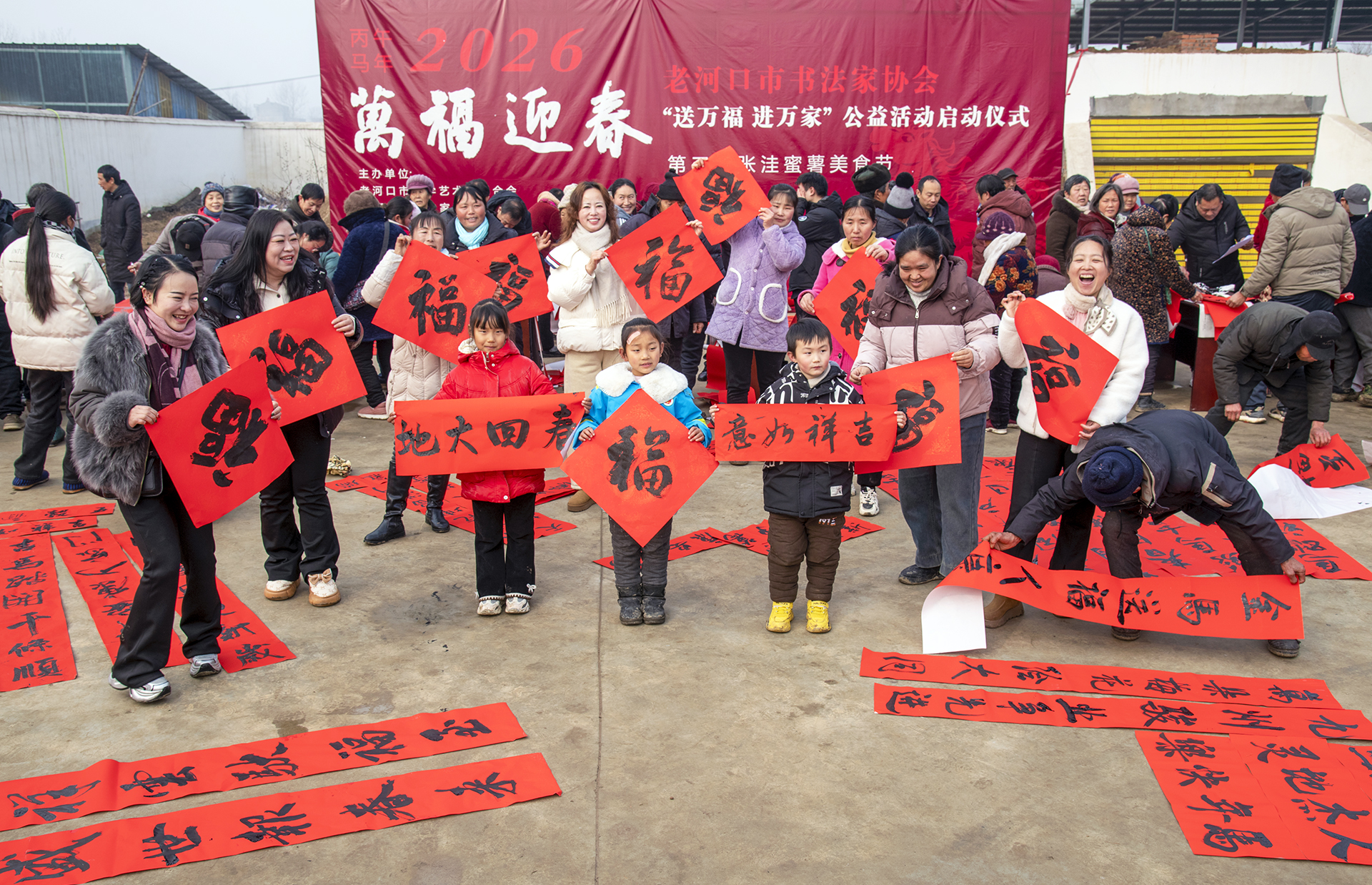 与此同时,翰墨迎春氛围浓厚。活动邀请老河口市书协书法家现场义务送春联,红纸铺展,墨香氤氲,书法家挥毫写下“国泰民安”等新春祝福,600余副春联与“福”字被村民争相领取。墨香交织年味,将新春祝福送到村民心间。