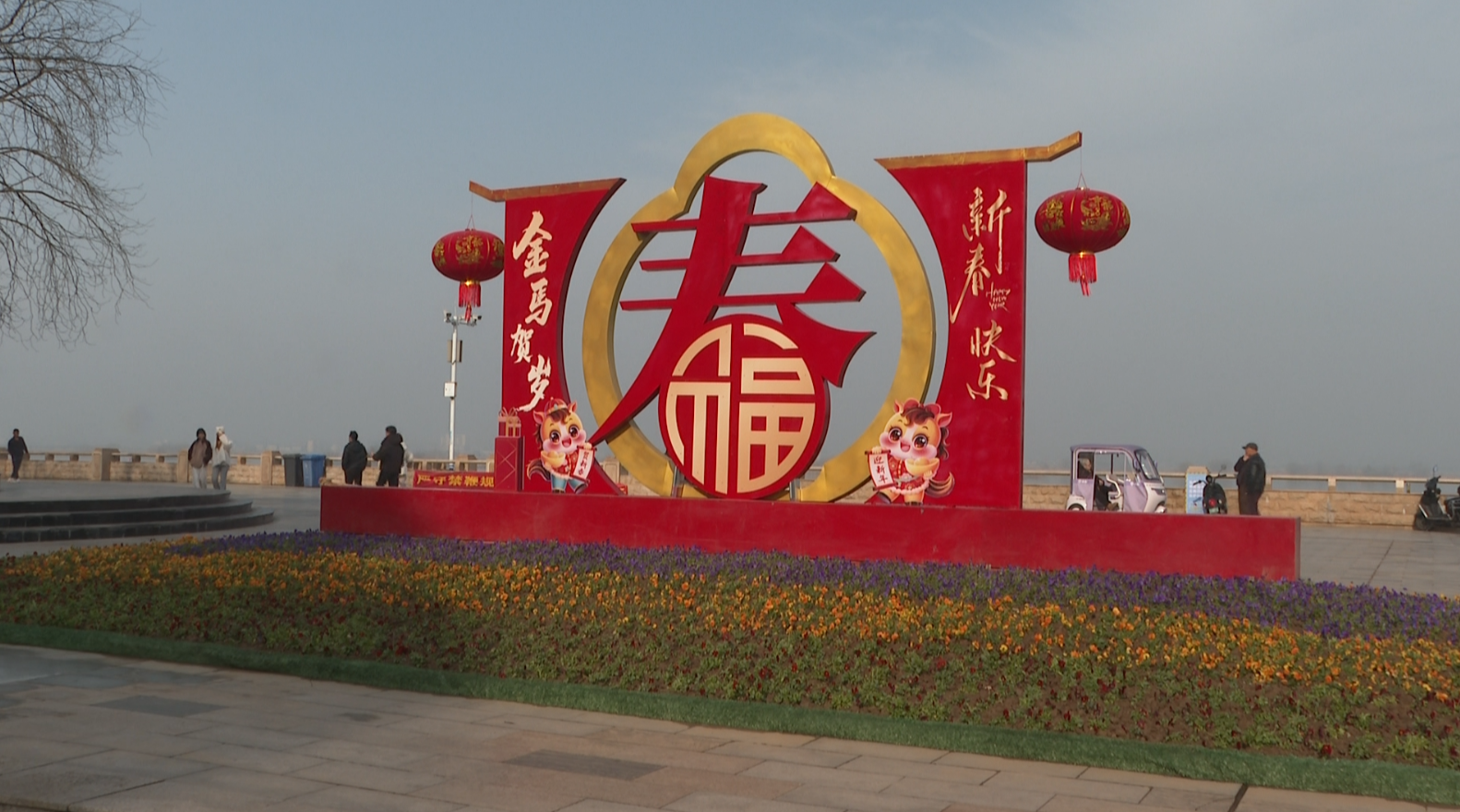 在抗战广场、滨江公园等重要公共场所,工作人员以3.6万盆蓝、黄、红三色堇为主要材料,巧妙构思,组合出大型主题鲜花组景。绚丽的花卉勾勒出“喜迎新春”“马年大吉”的鲜明主题,明快的色块交织碰撞,展现出蓬勃的生机与盎然的春意,引得不少市民驻足观赏、拍照留念。