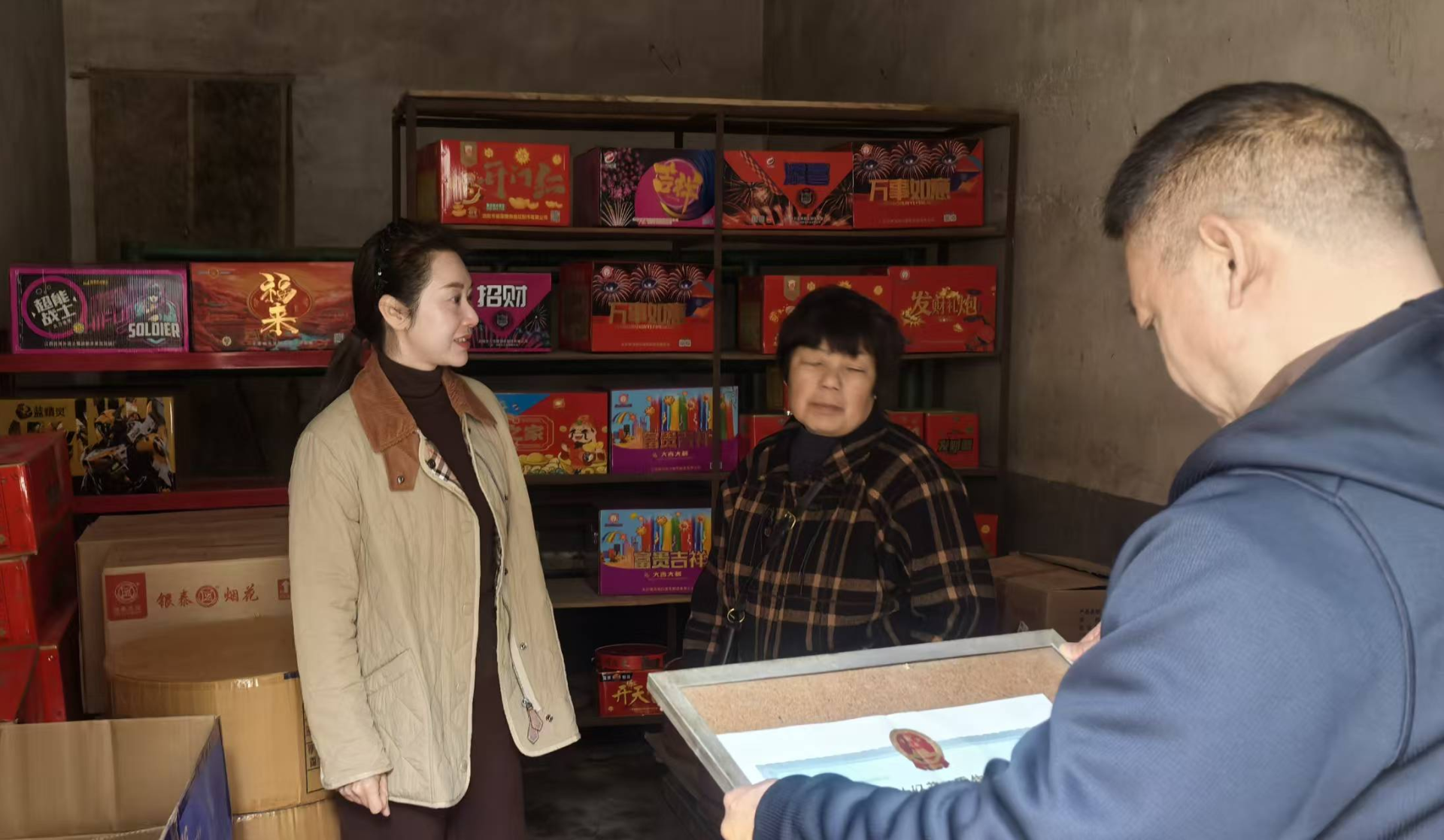 在袁冲乡槐树湾村宏兴烟花爆竹销售有限公司,尚钰详细询问企业安全风险管控、员工安全培训、日常巡查值守等工作开展情况。随后,她到专用储存仓库进行实地查看,重点检查仓库安全条件、消防设施配备、货物规范堆放、警示标识设置等关键环节。