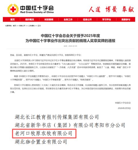 近日,中国红十字会总会发布《关于授予2025年度为中国红十字事业作出突出贡献的捐赠人奖章奖牌的通报》,老河口牧原农牧有限公司成功上榜,荣获“中国红十字奉献奖章”。