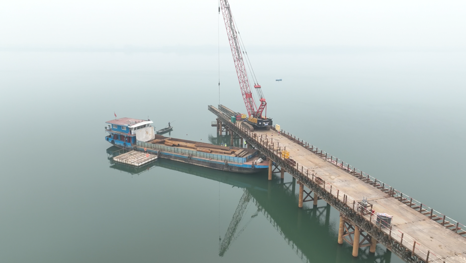 近日,记者在G328河谷汉江二桥及接线工程王府洲引桥段看到,施工方正在加快施工进度,目前已完成王府洲引桥段20%工程量。
