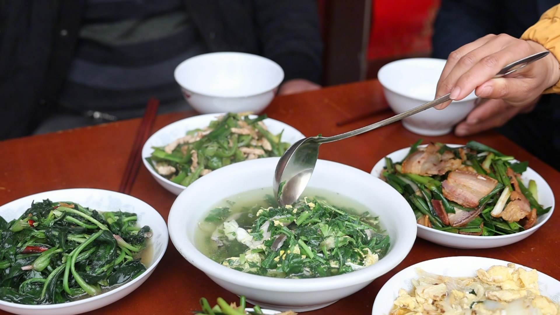 将采摘回来的地米菜清洗干净,本地家常烹饪中常搭配菌菇制作蛋花汤,简单的烹饪,能最大程度激发食材本身的鲜甜。