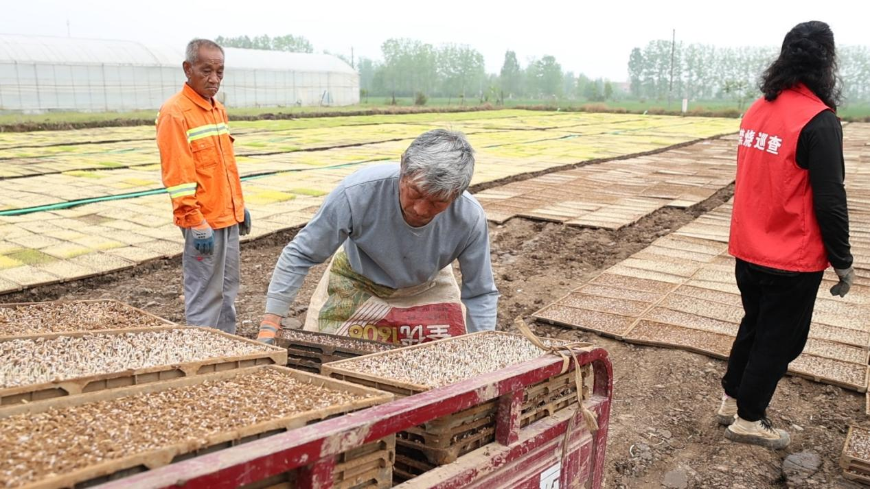 温室大棚内,一盘盘秧苗排列整齐,青翠欲滴、根强苗壮,长势格外喜人;农户们穿梭其间,有的手持喷淋设备细致浇水,有的弯腰起盘、搬运装车,各个环节都井然有序。