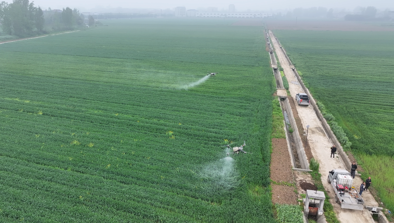 在李楼镇付家堤村的连片麦田里,多架植保无人机正低空穿梭,均匀喷施药剂。